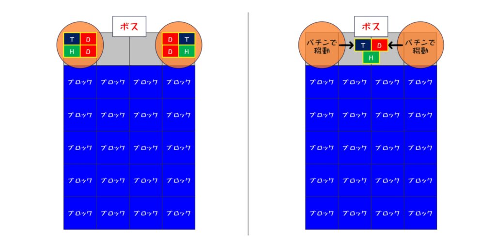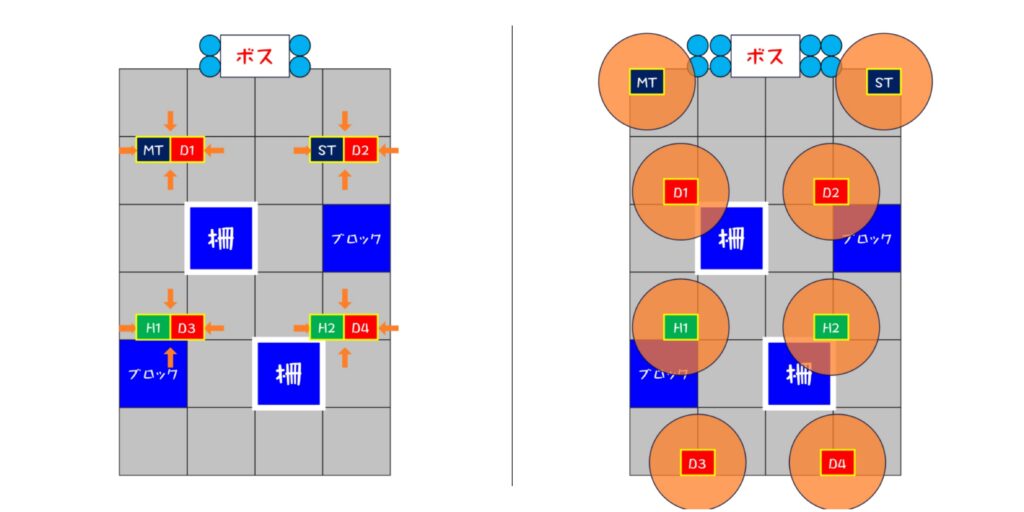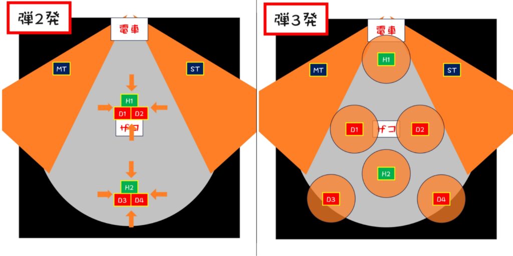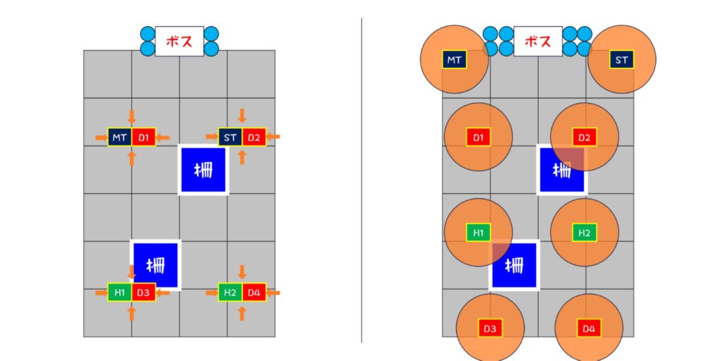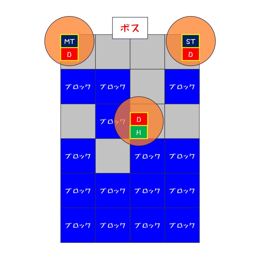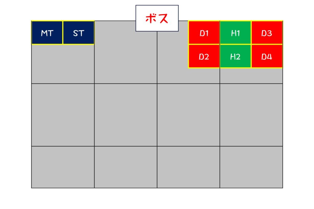 2. タンクは左前、他は右前に集まって軽減(MT、H1、D1、D3)(ST、H2、D2、D4)